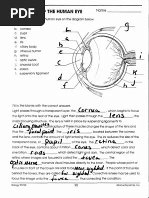 Print out the a%ached eye anatomy assessment and eye comparison assignment . The light travels through the clear cornea of the eye, and then the lens, which focuses the light. The 2nd page is the instructor's guide with the correct answers. With the diagram of the human eye. Learn about the anatomy and .